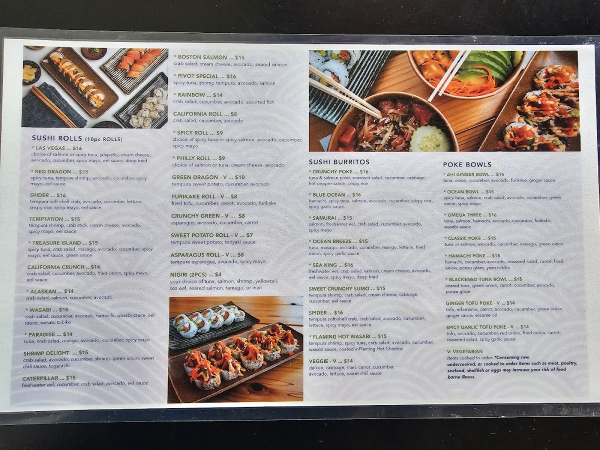 Spider b-ritto, rainbow, tuna poke bowl, california roll, spicy tuna roll.